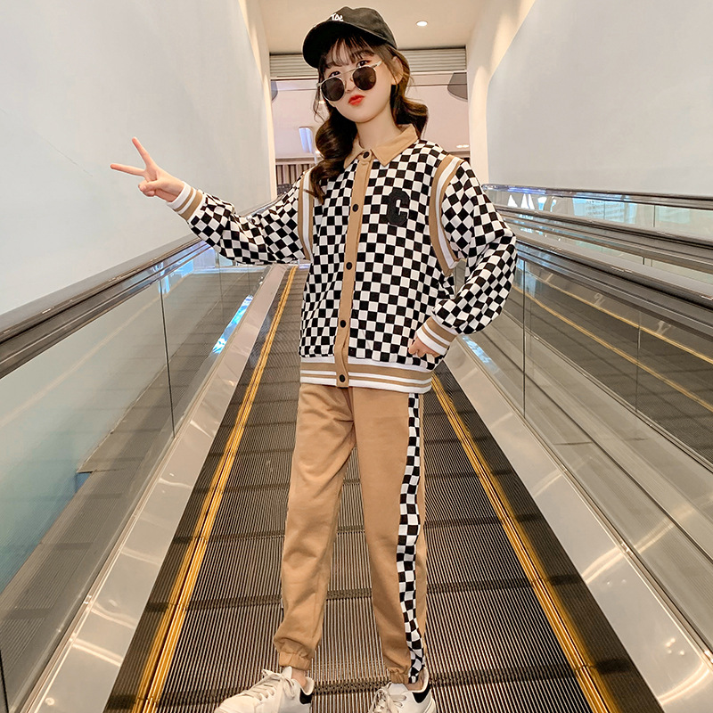 2023 New Set: Two Piece Set of Checkerboard Spring and Autumn Sports Elastic Loose Baseball Suit for Children, Girls,