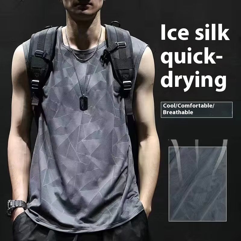 2023 Summer Mesh Ice Silk Sleeveless Tank Top with Loose Shoulder and Trendy Men's Sports Basketball Fitness T-shirt Top