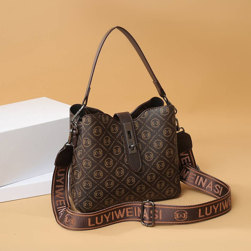 2024 New women's bucket bag, vintage printed shoulder bag, wide strap crossbody bag