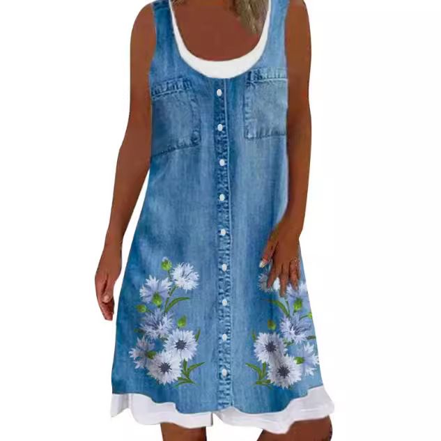 2024 Trendy Summer 3D Printed Elastic Waist Strap Dress Slimming Versatile Mid-Length Dress for Women
