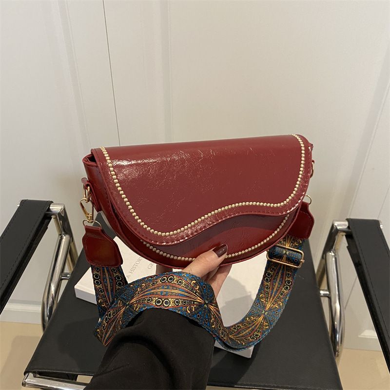 2025 Solid Color New Trendy Fashionable Simple Textured Wide Strap Crossbody Shoulder Women's Saddle Bag