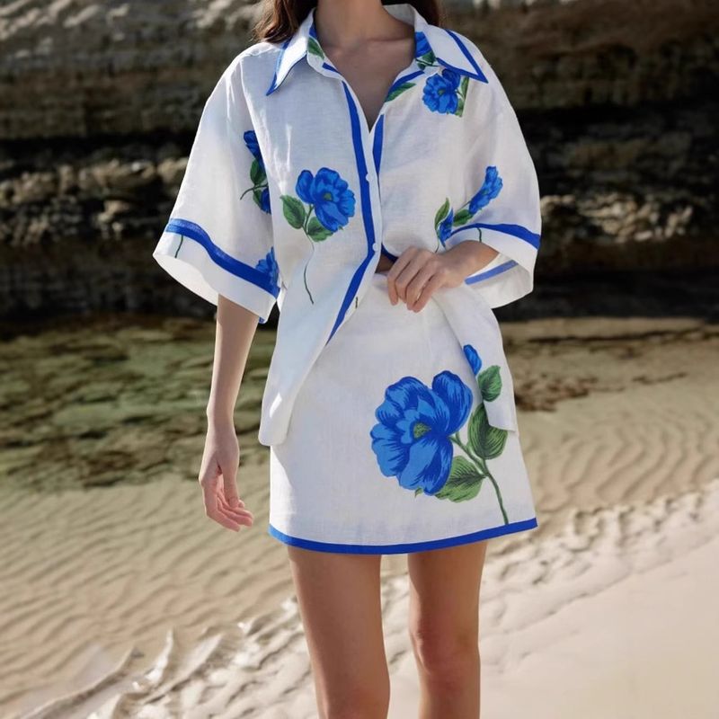 2025 Summer Women's Casual Printed Linen Short Sleeve Shirt and Bodycon Skirt Set