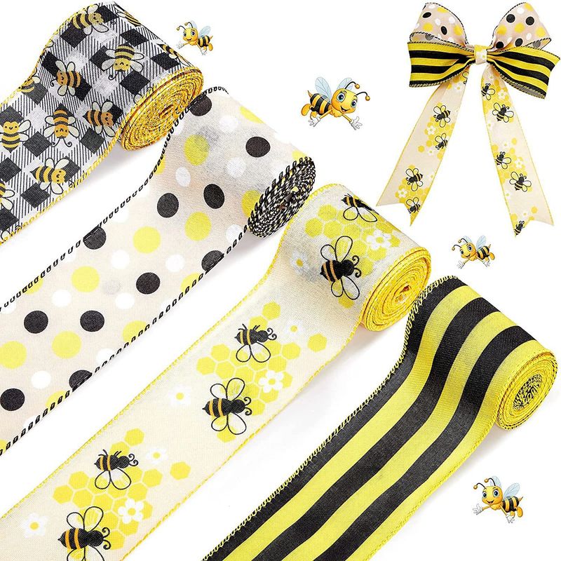 4 modele panglică de albine, imprimare color, panglică cu puncte, fundă de in, decorațiuni DIY pentru realizarea de panglici