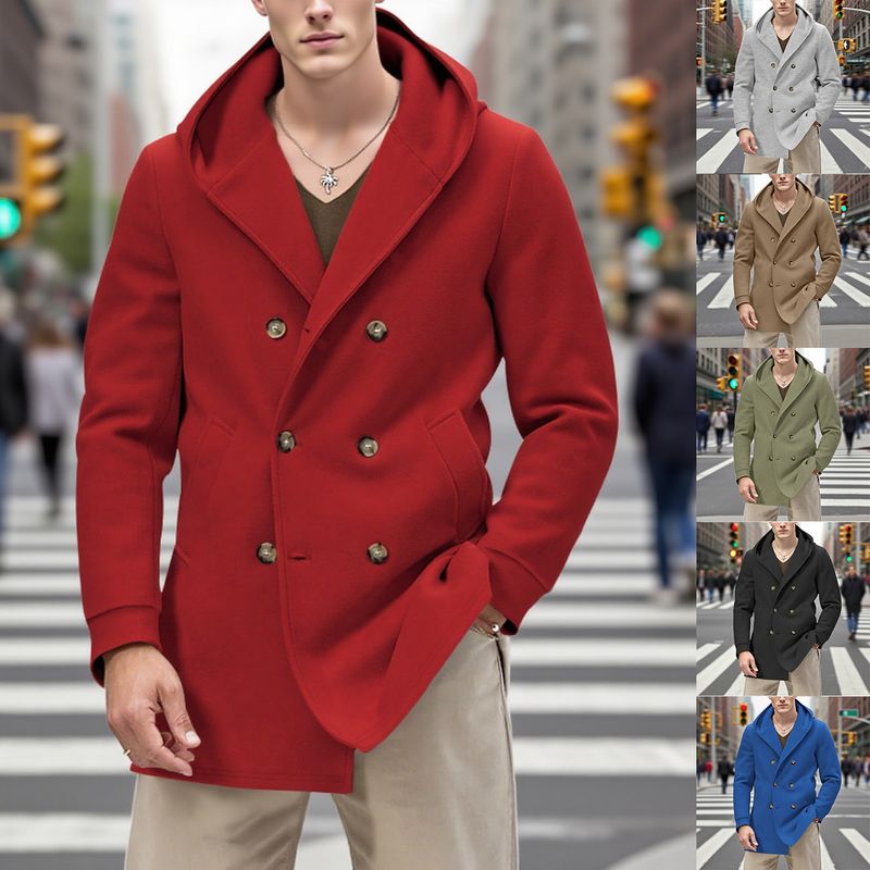 Autumn Solid Color Mid-Length Double-Breasted Trench Coat Men's Casual Turn-Down Collar Hooded Overcoat