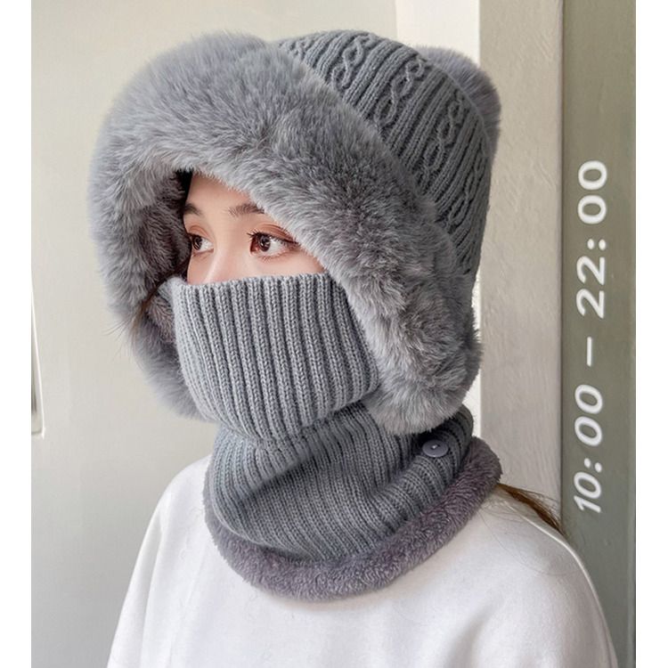 Autumn Winter Braided Knitted And Scarf Combo Outdoor Cycling Face Shield Fleece Lined Thickened Warm Wool Hat