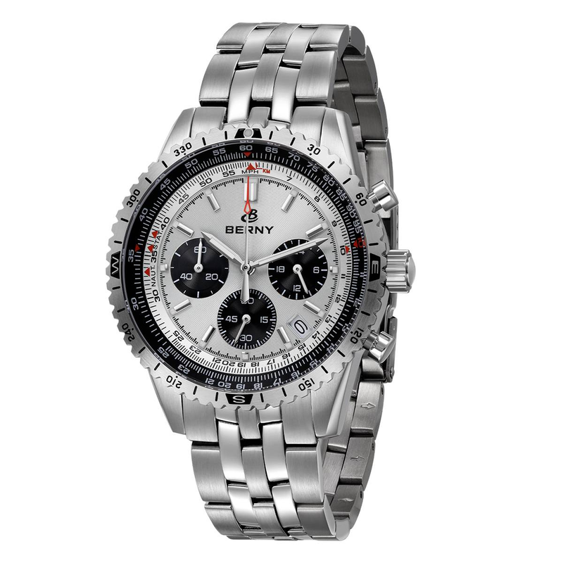 BERNY Silver Chronograph Watches For Men Multifunction Quartz Watch With Tachymeter Date Stainless Steel Waterproof Luminous Sapphire Wristwatch
