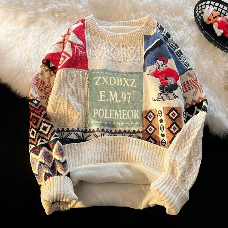 Product Source Category:In Stock,Material function:other,Item Number:M24,Brand:other,Design 1:Pullover,Design:Loose Fit,Collar Style:Round Neck,Sleeve Length:Long Sleeve,Thickness:Fleece-lined,Style:Vintage,Design details:Jacquard Pattern,Bargain Category:Youth Fashion 18-24 Years Old,Is it in stock?:yes,Inventory Type:Complete order,Suitable for everyone:Teenagers,Year/Season of Release:2025 Winter Season,Fabric Name:Cotton Blend,Main fabric composition:Polyester Fiber Dacron,Content of the main fabric components:65,Applicable Scenarios:Casual,Suitable for the season:Winter,Applicable to the target audience:Teenagers,Color:JM24-Red with Fleece, JM24-Apricot with Fleece, JM24-Blue with Fleece, M24-Red Regular, M24-Apricot Regular, M24-Blue Regular,Size:M, L, XL, 2XL,Craftsmanship:Jacquard Pattern,Is it exclusively for cross-border export supply?:No,Original Design Source:No,Is there a quality inspection report?:No,Suitable age group:adult,Applicable Gender:Male,Receive the Label:No Collar Label,Product Category:Knit Sweater,What is the source type?:Other brands,Hang Tag:No tags
