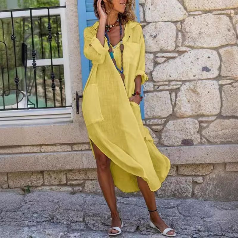New solid color cotton and linen slit loose and breathable casual long sleeved shirt, mid length dress