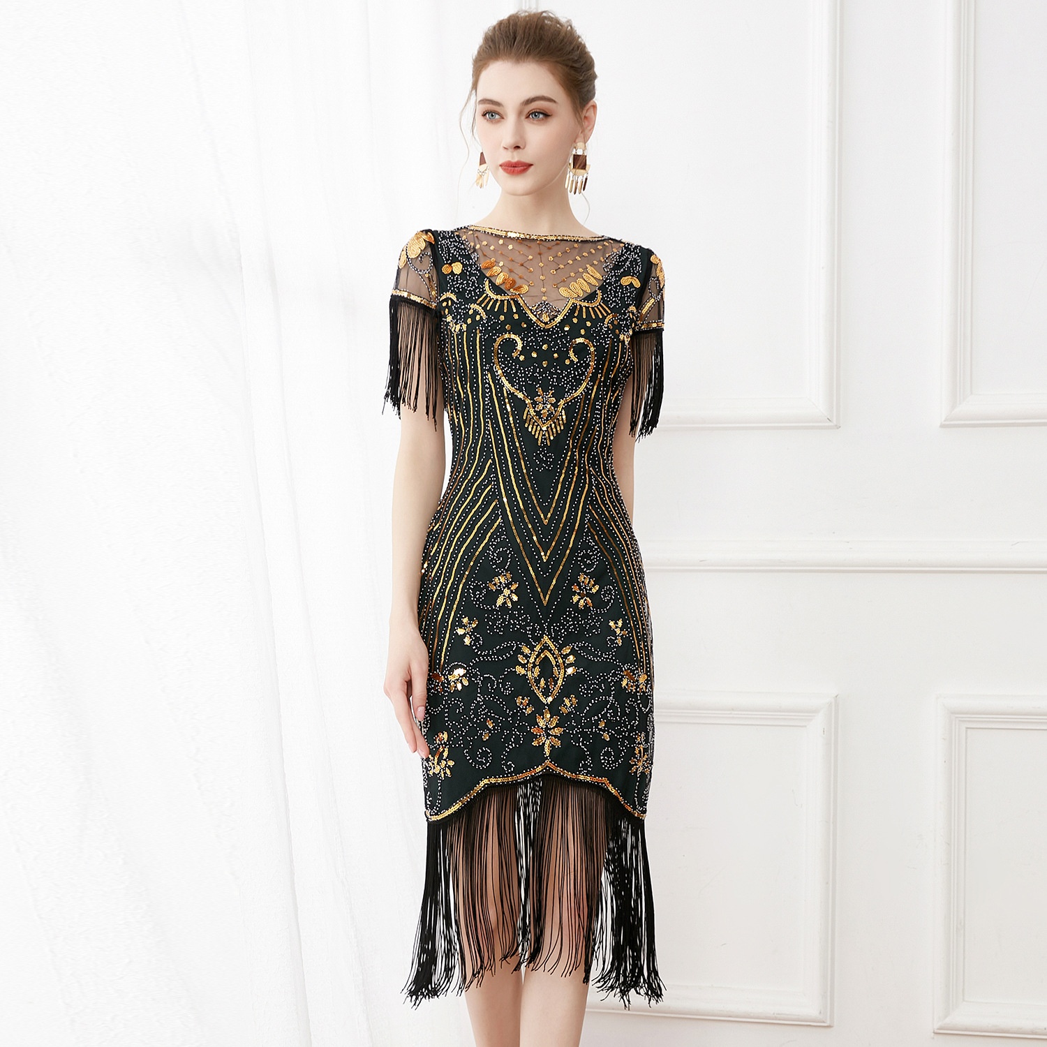 ChicShe 1920S Retro Ball Gown With Embroidery And Tassels, Cocktail Party Plus Size Sequin Beaded Mesh Dress