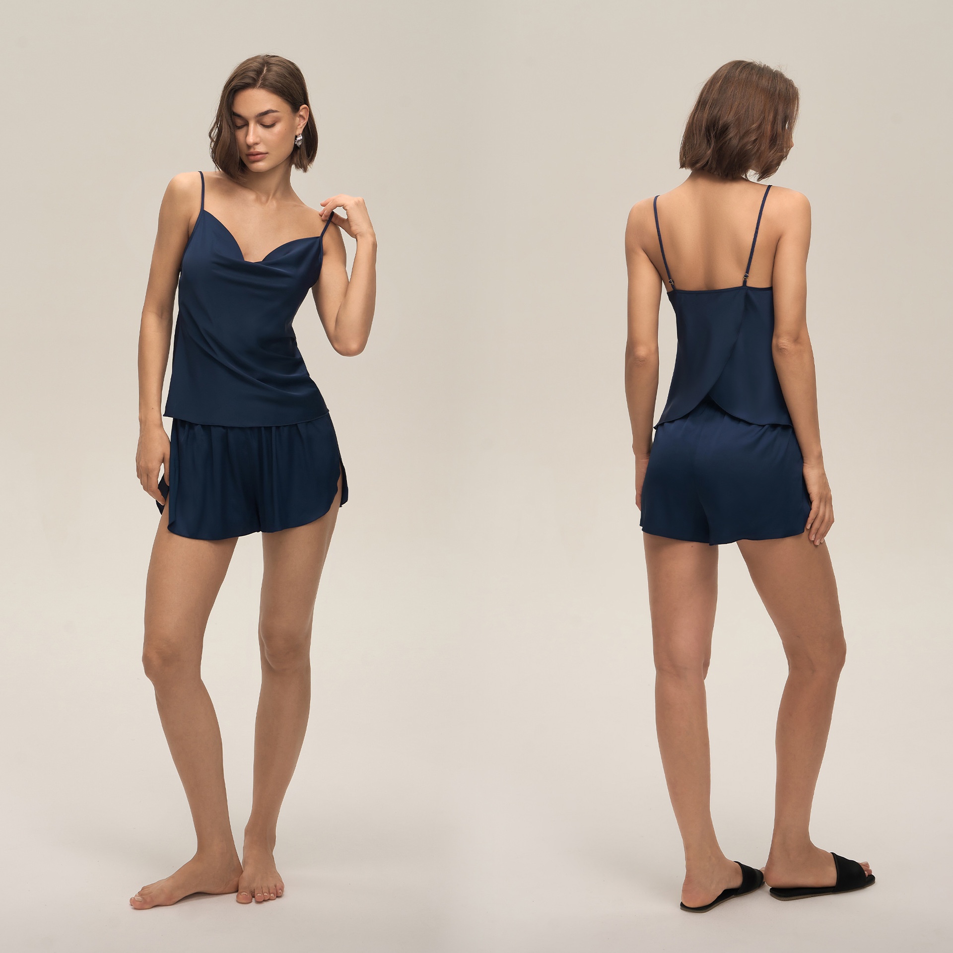 Product Category:Set,Fabric Name:Satin Chiffon,Design:Set,Main fabric composition:Polyester Fiber,Thickness:Lightweight,Fabric Thickness and Weight:Ultra-thin 81-100g/m²,Collar Style:Collarless,Sleeve Length:Sleeveless,The length of the pants:Shorts,Functionality:Casual, Sleep, Bathing, Home, Cool, Comfortable,Time to market:Autumn 2025,Suitable for the season:Summer, Spring, Autumn,Applicable to all categories of people:young women,Applicable Scenarios:Outdoor, Home, Hotel Bathhouse,Color:Black, navy blue, pink,Size:S,M,L,XL,Brand:Yao Ting,Origin:Taizhou,Item Number:3928,Is it exclusively for cross-border export supply?:yes,Main fabric ingredient content:95% included - 100% excluded,Style:European and American Style