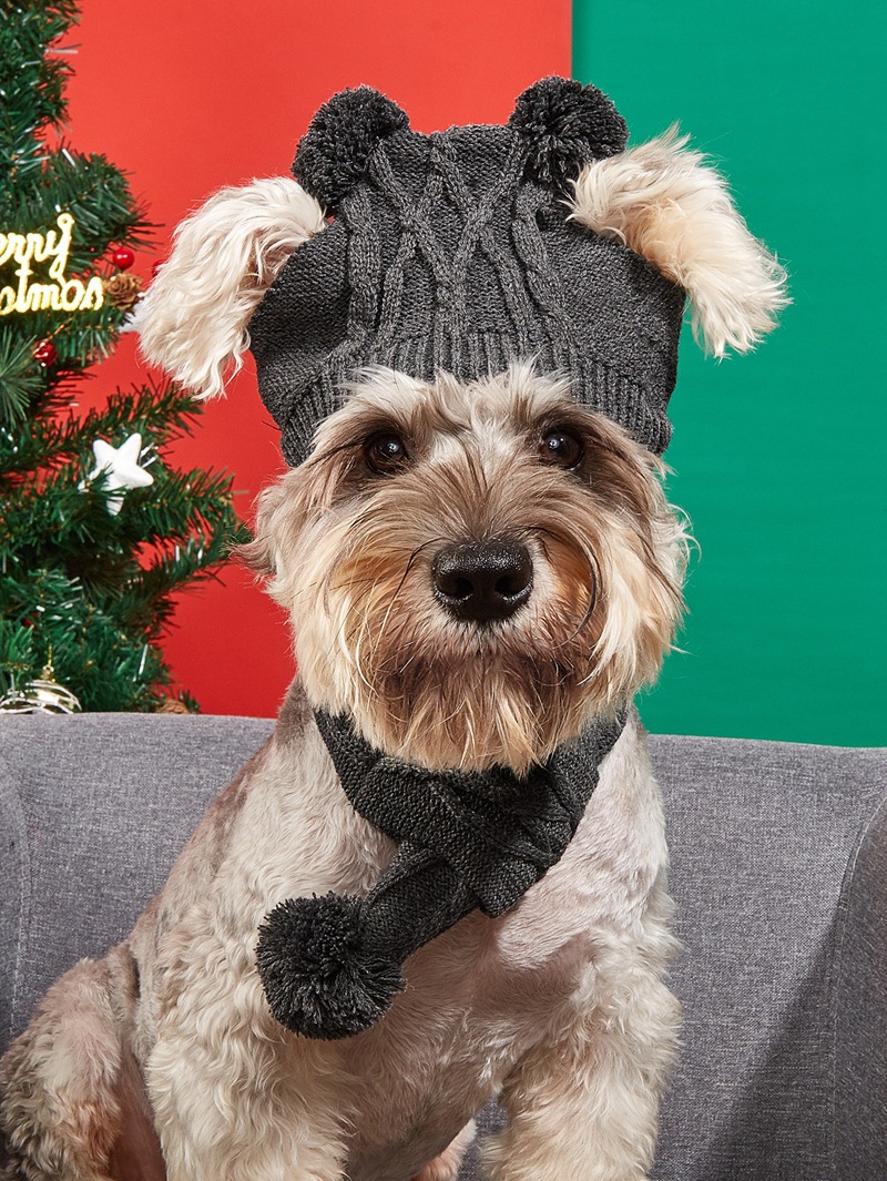 【Product Name】Christmas new pet dog knitted cute warm fur ball snowflake triangle lattice multi color Scarf and hat set