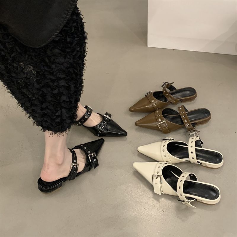 Chunky Heel Closed Mules For Women, New Spring/Summer 2025 Style, Pointed Toe With Belt Buckle, Black Single Shoes
