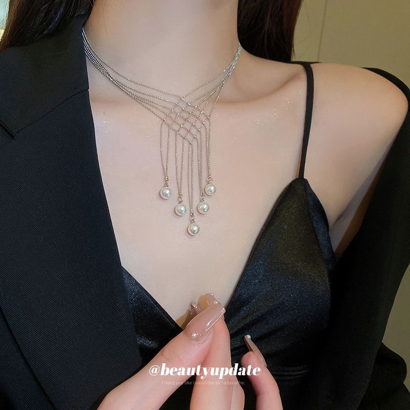 Colier multistrat cu perle în formă de diamant, stil rece și distant, cu ciucuri, și un design luxos și claviculă ușoară