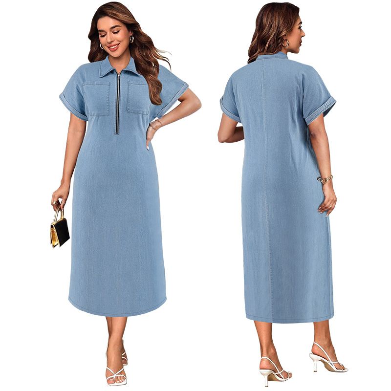 F218526 plus size women's denim lapel short sleeved zipper mid length dress