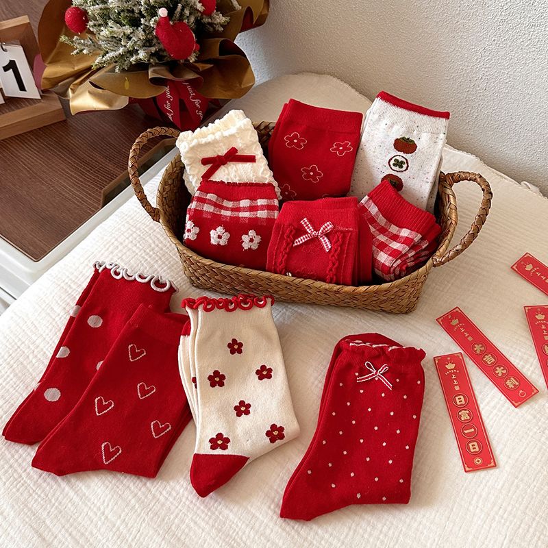 Festive Atmosphere Red Socks Women's Medium Tube Socks Autumn And Winter Piled Cotton Socks Big Red Socks