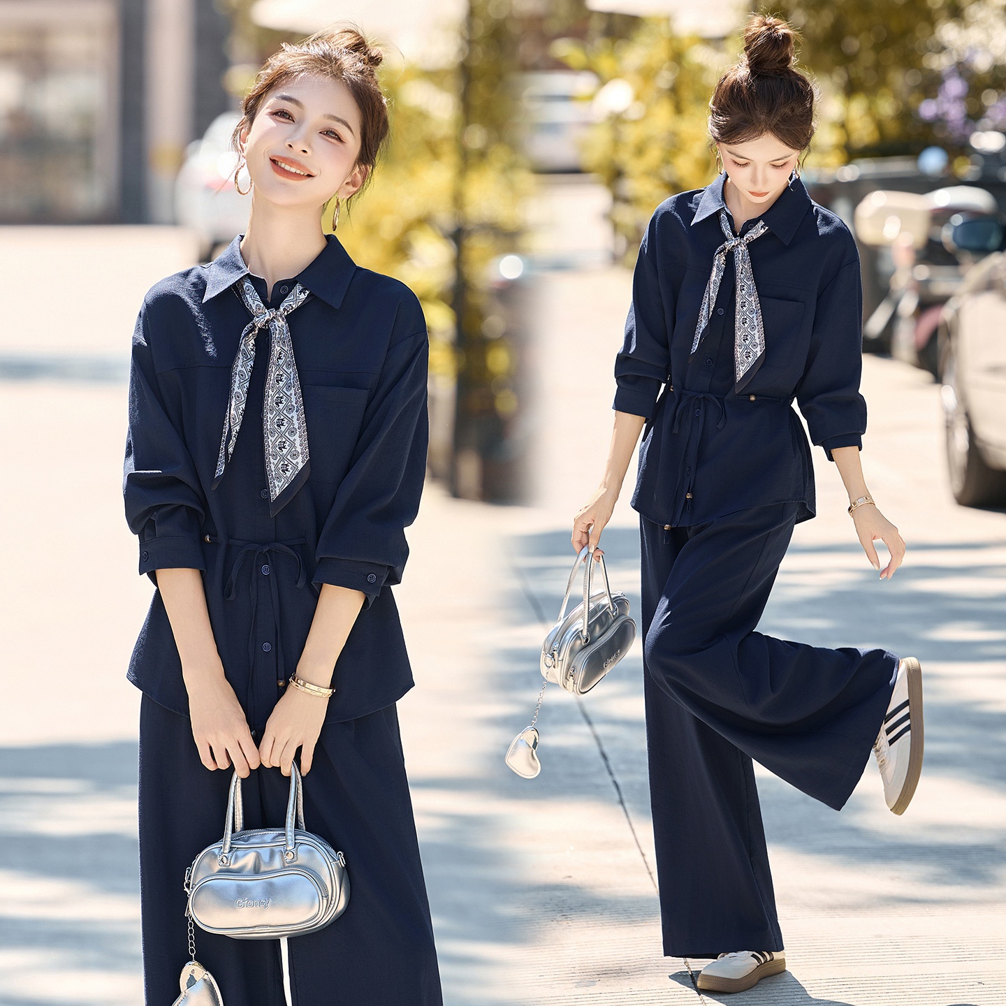 GraceChic 2025 New Women's Loose Slimming Shirt Elastic High Waist Belly Covering Age-Reducing Wide-Leg Pants Two-Piece Set MU8088