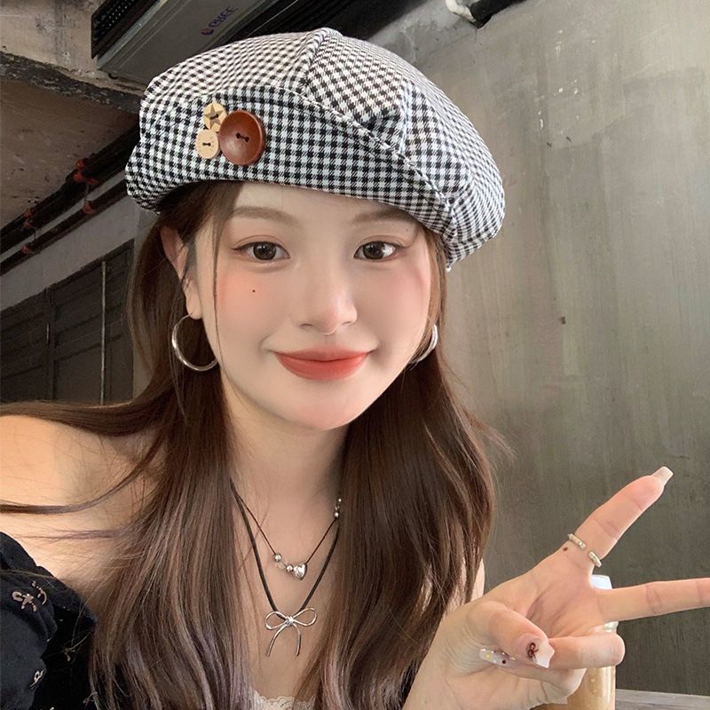 Handmade Button Plaid Clouds For Women, Spring Black And White Checkered Beret, Octagon Hat, Artistic Painter's Hat