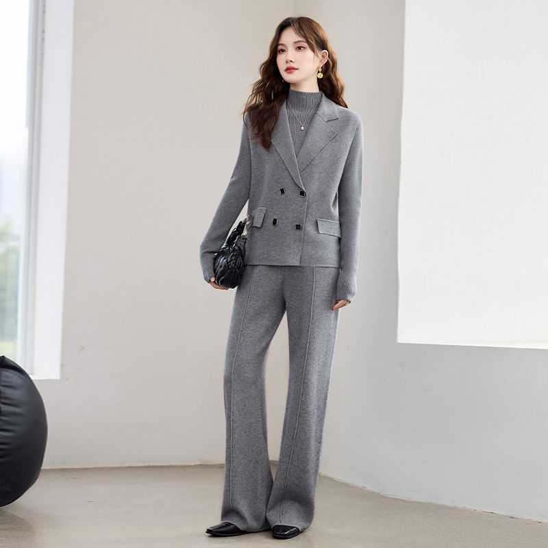 High-End Suit For Women 2025 Autumn New Professional Elegant Double-Breasted Knitted Vest Wide-Leg Pants Three-Piece Set