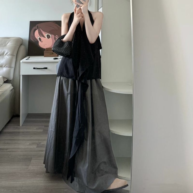 New French Style Halter Neck Ribbon Vest Top Women's Summer Slimming Long Skirt Two-Piece Set