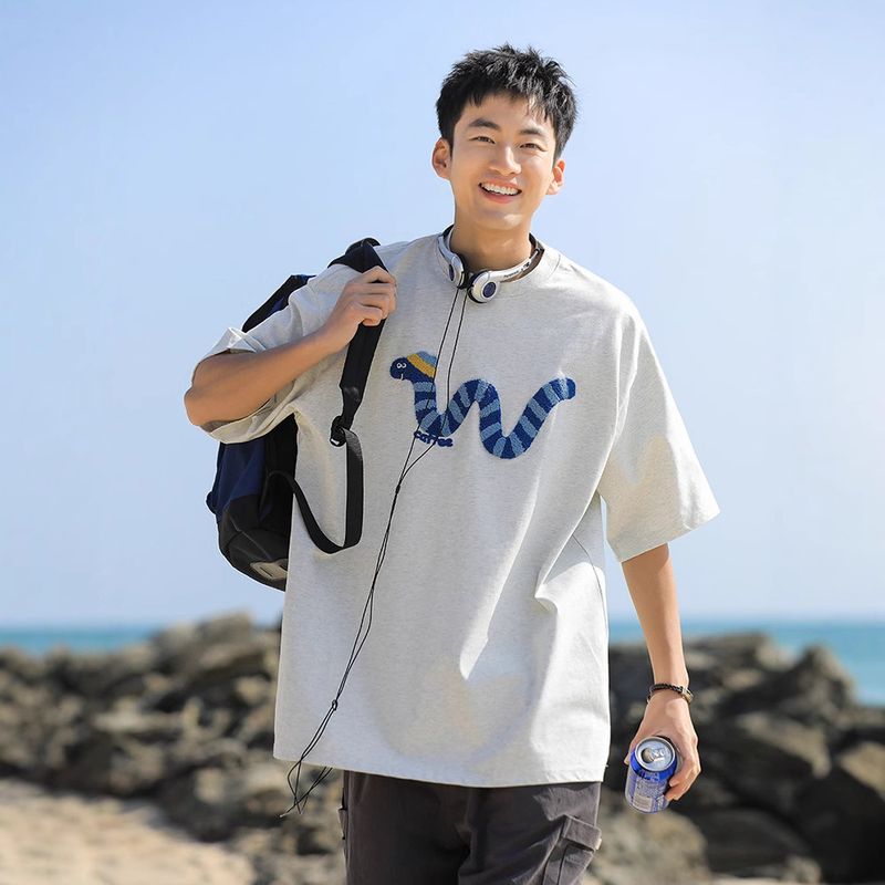 Niche Design Greedy Snake Towel Embroidered Loose Short sleeved Men's Summer American Pure Cotton Short sleeved T-shirt