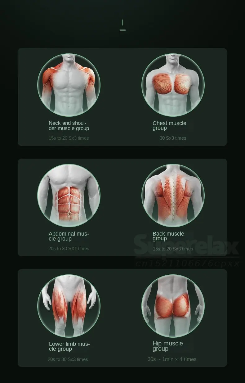 According to the intended frequency of use, it is used for warming up, relieving pain, injuring muscles, activating muscle pain, and relieving tension; Increase larger and stronger muscle groups at a higher speed.