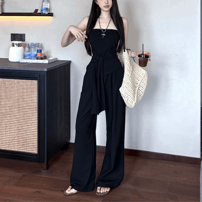 Pure Desire Two-Piece With Irregular Design, Tie-Up Tube Top Vest, High-Waisted Draped Casual Pants, Long Pants Set For