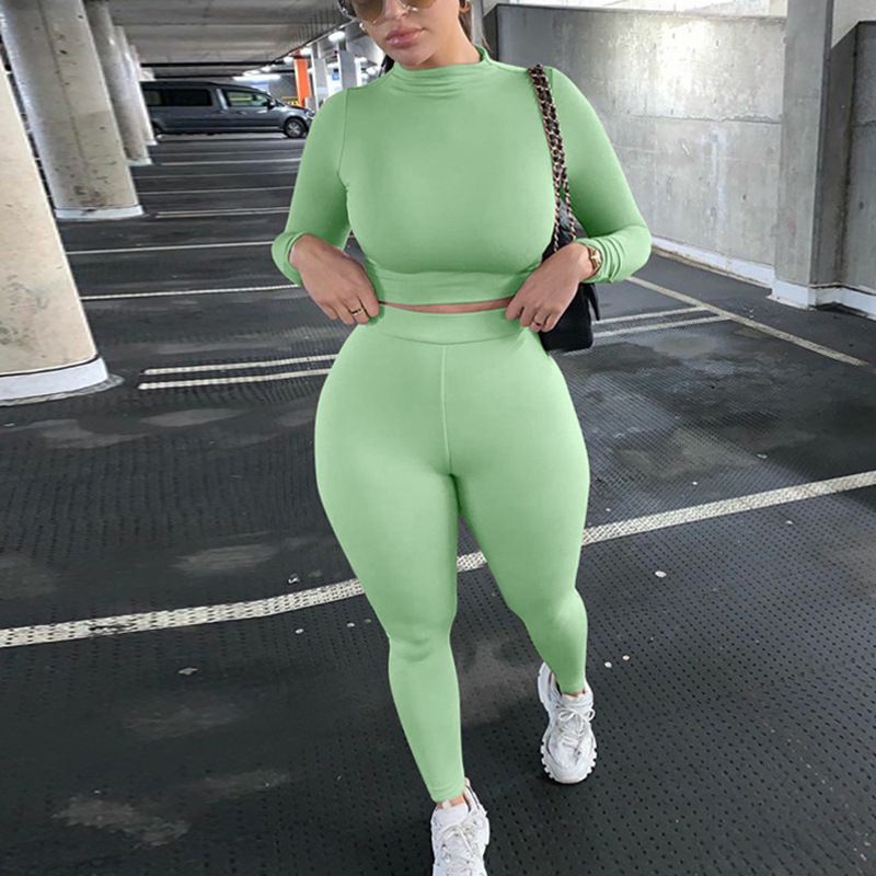 Set sport și casual versatil pentru femei, cu guler rotund, mânecă lungă + pantaloni strâmți pentru ridicarea feselor, format din 2 piese, pentru femei