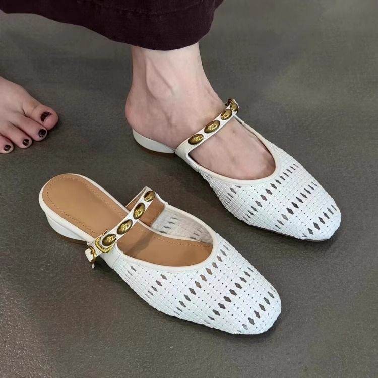 Sheepskin Version~ Genuine Leather Woven Hollow Half Slippers Women, Breathable Slip-On Lazy Mules For Wearing With