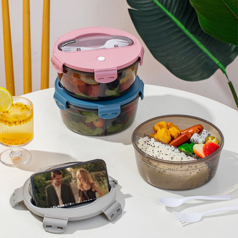 Three-Compartment Round Lunch With Spoon And Fork, Microwaveable, Convenient Container, Kitchen Fruit Preservation Box,