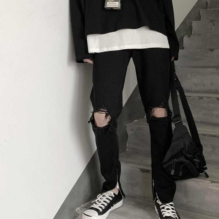 Versiune coreeană a blugilor negri, lejeri, cu picior drept, la modă, de vară, cu găuri mari, pentru bărbați, casual și versatili.